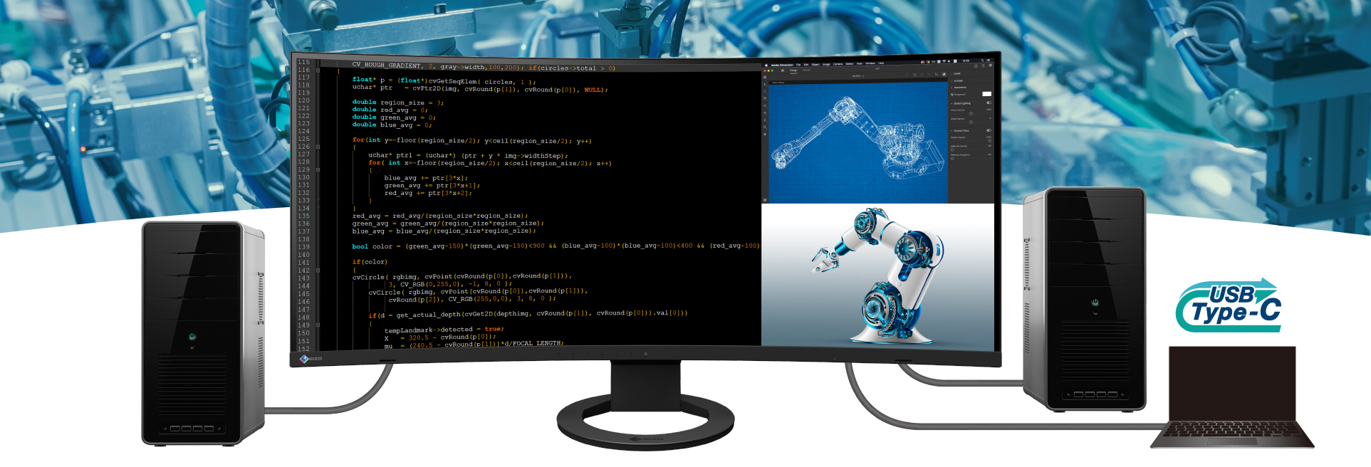 The closer you sit to a large monitor, the greater the distance between your eyes and the far edges of the screen. The FlexScan EV3895 ultrawide, curved monitor gently brings the edges in to a more comfortable distance, improving visibility, focus, and immersion. It also has Picture-by-Picture (PbyP) which allows it to receive up to three video signals simultaneously, making switching between video and audio sources a breeze.